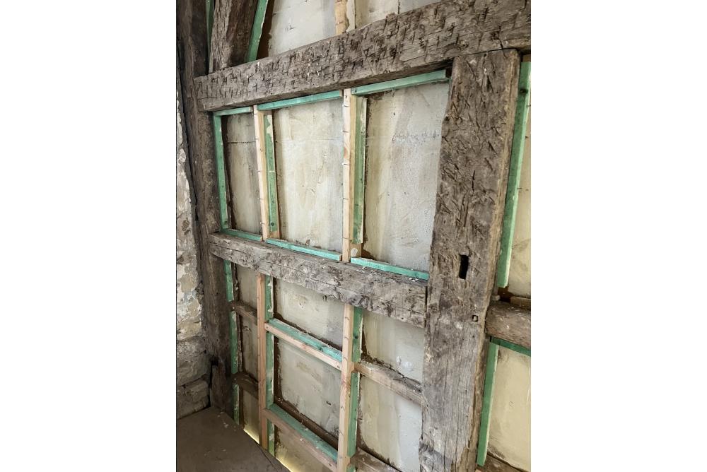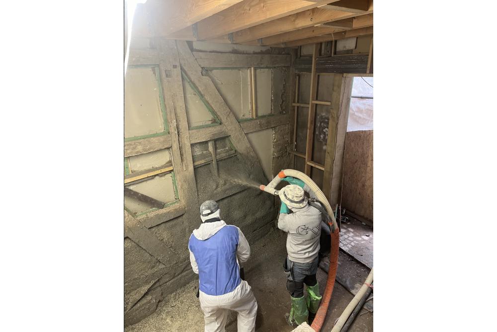 Remplissage d'un colombage dans un maison unifamiliale; projetage d'une isolation au béton de chanvre.